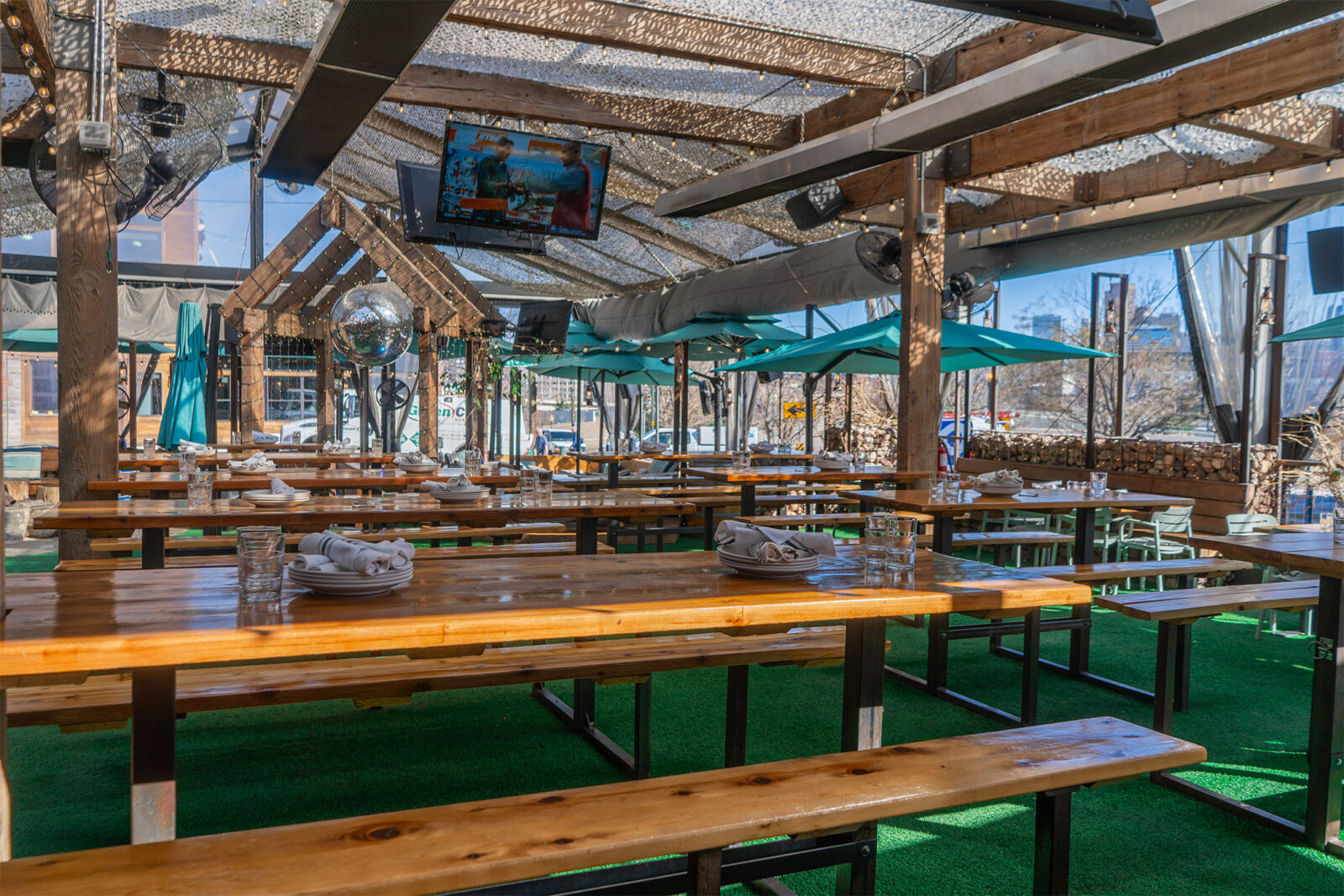 The patio is the best spot for those who love to be the center of it all. There is plenty of seating for your entire party at our picnic tables and fire pit while a giant disco ball twirls overhead.